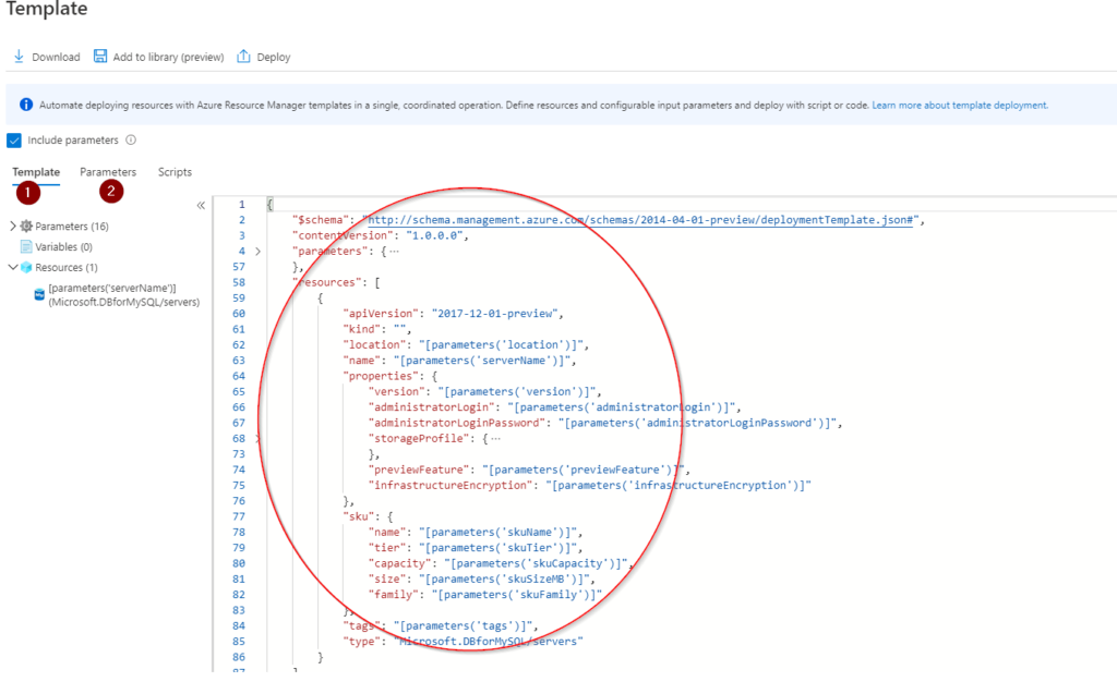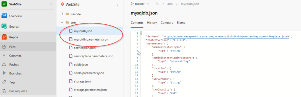 From the Template page(1) you can just copy everything from the Template page into a new file in Git “mysqldb.json” in the ARM folder. From the Tab Parameters copy everything in to a new file “mysqldb.parameters.json” in the Same folder.